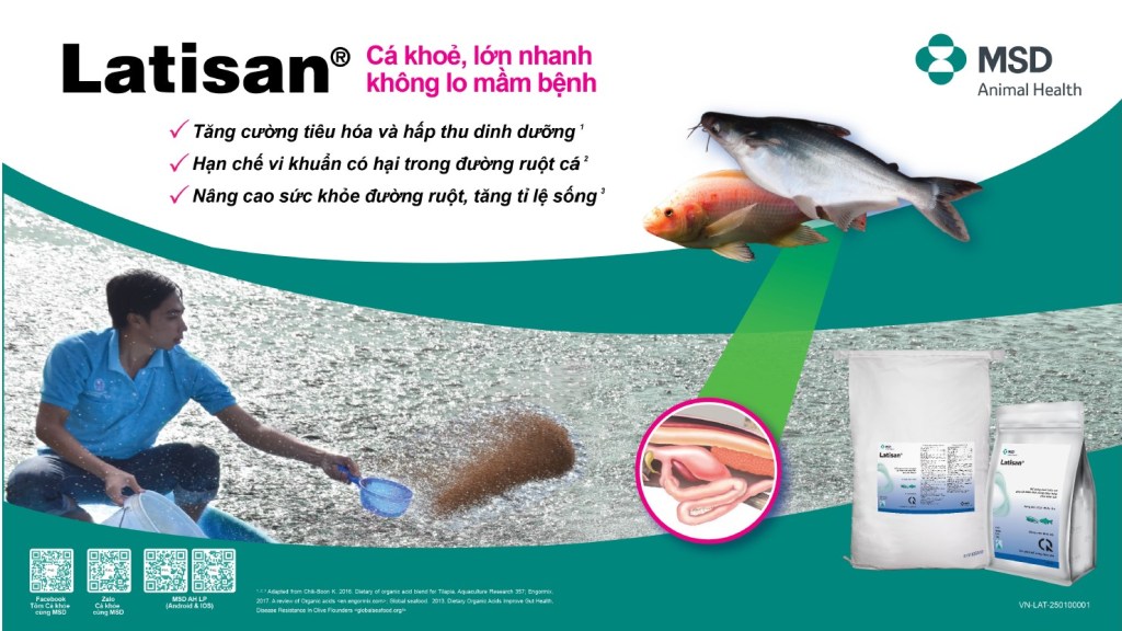 Trộn Latisan® 0.5 -1 kg/ tấn cá, hoặc 1 kg / 20 – 40 tấn cá, dùng liên tục từ lúc thả cá đến khi thu hoạch, đặc biệt vào thời điểm giao màu hoặc cá có biểu hiện khó tiêu (phình bụng, phân sống).