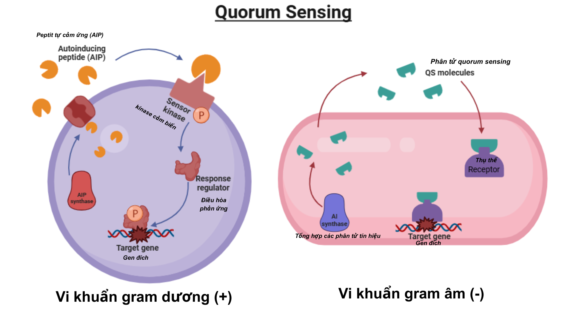 Bảng: So sánh sự khác biệt giữa quorum sensing vi khuẩn gram âm (-) và gram dương (+)