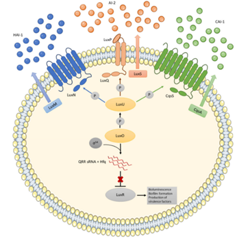 3 phân tử tính hiệu HAI-1, AI-2 và CAI-1 lần lượt được tổng hợp bởi enzyme LuxM, LuxS và Cqs A. Khi mật độ tế bào cao, các chất tự cảm ứng này được các thụ thể LuxN, LuxPQ và CqsS phát hiện. Sau đó diễn ra quá trình khử Phospho (P) để vô hiệu hóa LuXO, cho phép tổng hợp LuxR và phiên mã các gen để gây phát sáng, tạo màng sinh học và sản sinh độc tố.