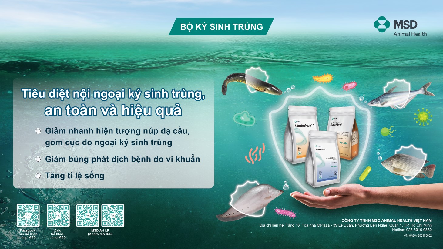 Tiêu diệt nội ngoại ký sinh trùng an toàn, hiệu quả. Giảm thiệt hại do bội nhiễm bệnh vi khuẩn gây ra trên cá.
