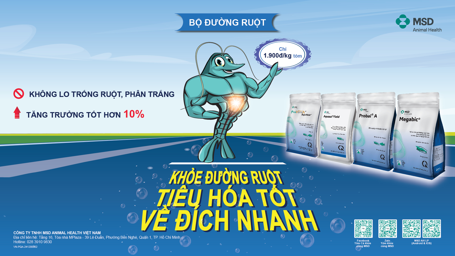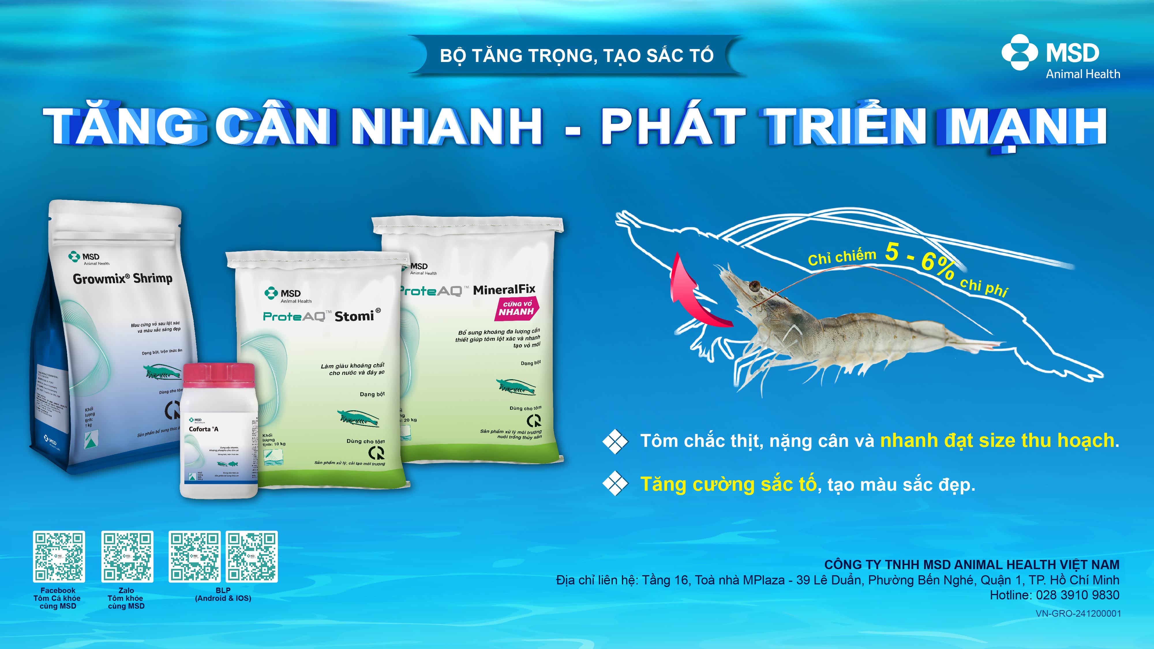 Giúp tăng hấp thu dinh dưỡng, tăng tạo cơ thịt và cung cấp đủ khoáng chất cần thiết hỗ trợ tôm tăng trưởng tối đa, lột xác tốt, rút size và tăng cân nhanh chóng.