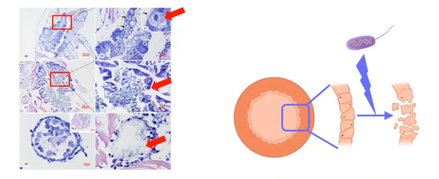 Vibrio (VTPD) có chứa protein-độc- tính-cao (Vibrio High Virulence Protein- VHVP) gây độc cấp tính đối với biểu mô gan tụy, đường ruột hậu ấu trùng. Các tác nhân VHVP này làm bong tróc tế bào biểu mô gan tụy và ruột giữa, tương tự với cơ chế gây hại của bệnh hoại tử gan tụy cấp, nhưng độc lực của VTPD cao hơn VAHPND 1000 lần.