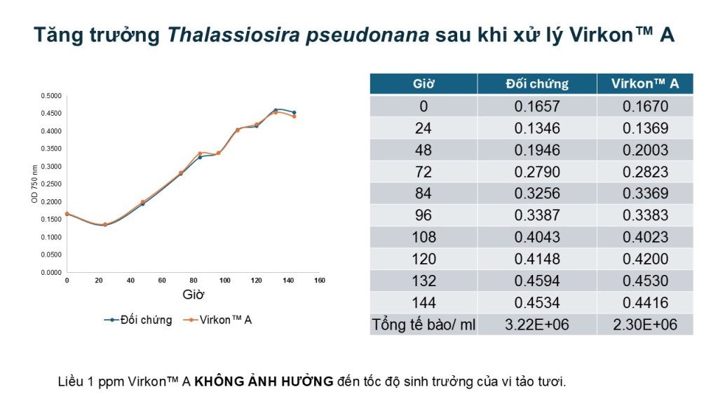 - An toàn với môi trường nước ao nuôi. Virkon™ A không gây chết tảo và không làm biến động các yếu tố chất lượng nước. Nghiên cứu cho thấy với liều cao khoảng 10 ppm không gây ảnh hưởng tới pH, oxy hòa tan và chỉ khi dùng liều 18 ppm mới gây ảnh hưởng đến tảo.
